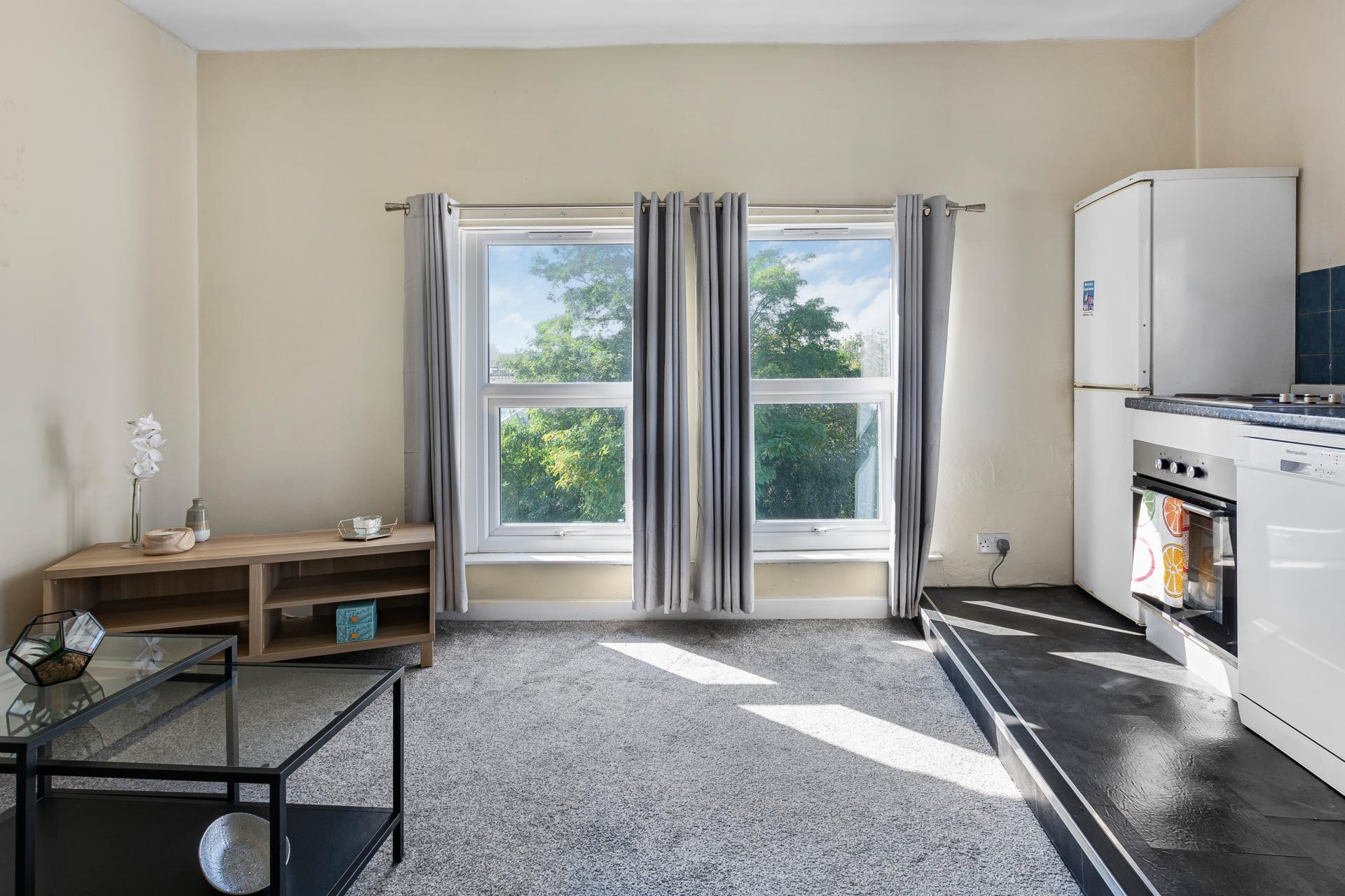 The property features a spacious lounge with an elevated fitted kitchen including a washing machine and dishwasher. The fully tiled shower room is finished to a contemporary standard, and the large double bedroom comes furnished with a double bed and modern décor throughout.